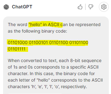 요즘 화두인 ChatGPT로 인간의 언어인 "hello"를 기계가 이해하는 언어(아스키코드)로 변환해달라고 요구했더니 아래와 같이 답변했다.