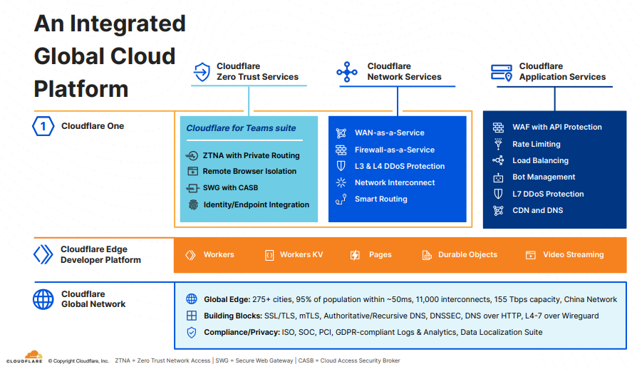 클라우드플레어의 서비스는 제로트러스트(보안), 네트워크, 어플리케이션, 그리고 개발자 플랫폼 4부분으로 분류할 수 있다.