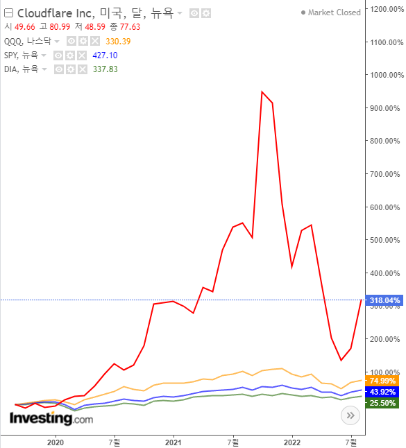 클라우드플레어의 매출은 회계연도 기준 2016년 $85M에서 2021년 $656M으로 매년 51% 증가했다. 그리고 최근 2022 Q2 분기 실적 발표에서 전분기 대비 54% 매출이 증가했다.