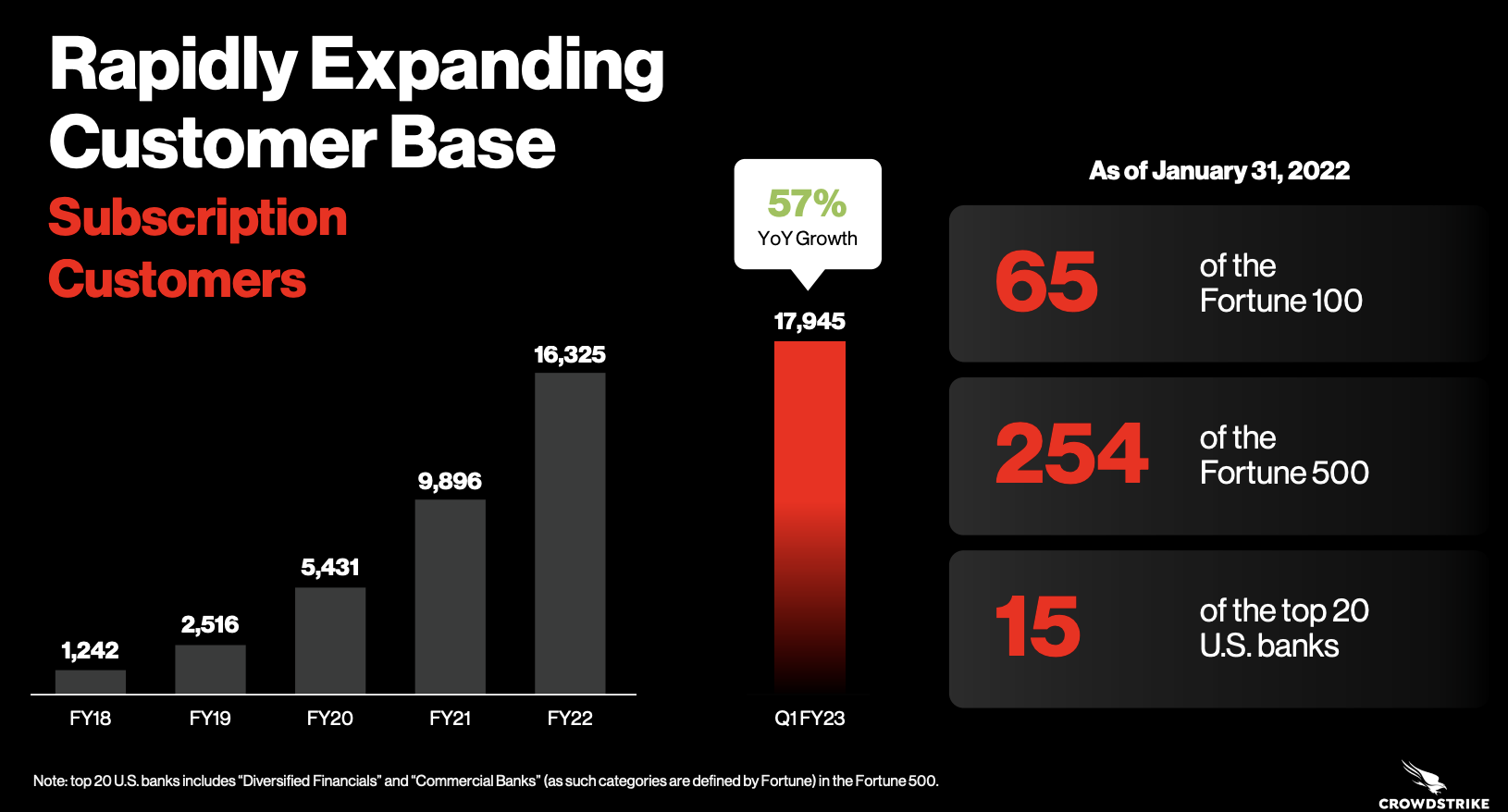 기술 성장주를 판단할 때 중요하게 생각하는 매출, 고객수 증가 추이 그리고 잉여현금흐름을 간단히 확인해보면, 매년 약 69% 구독 매출이 증가했고 61% 만큼 고객 수가 증가했다. 최근 회계연도 23년 1분기 실적 발표에 따르면 포츈 100대 기업 중 65개 기업, 포츈 500대 기업 중 254 기업, 미국 내 탑 20개 은행 중 15개 은행이 크라우드스트라이크의 제품을 사용했다.