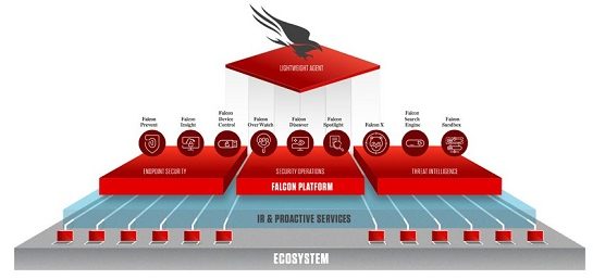 크라우드스트라이크는 EDR(Endpoint Detection & Response, 단말기 탐지 및 대응) 사이버 보안 부문에서 선두 기업으로 업계 최초로 클라우드와 보안 서비스를 접목해 클라우드 기반 솔루션을 내놓았다. 로고인 팔콘(falcon, 매)은 인공지능을 활용한 보안 솔루션 제품명이다.