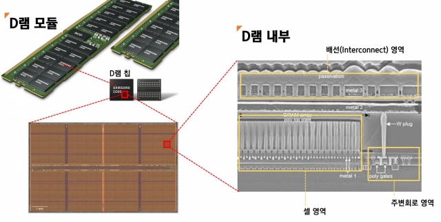 디램 칩 하나를 단면을 잘라 내부를 보면 크게 세 가지 영역을 볼 수 있다. 정보를 저장하는 셀(cell) 영역은 디램 칩의 대부분의 공간을 차지한다. 그리고 셀 영역을 돕는 주변회로(periphery), 셀과 셀, 주변회로 간 연결을 돕는 배선(interconnect) 영역이다.